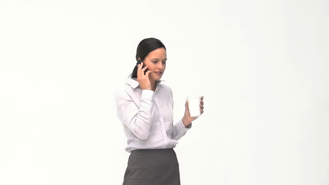 Woman dressed in office attire is engaged in a phone conversation while holding a cup of coffee. Neutral white environment highlights business focus. Useful for depicting themes of multitasking, professional communication, business environments, or advertising mobile and telecommunication services.