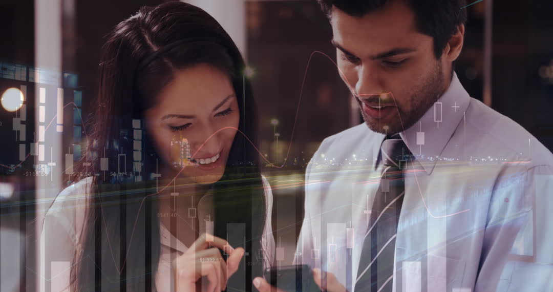 Two business professionals engage in analyzing financial data on a phone, with a digital overlay of stock market charts and a cityscape backdrop. The video could be used for themes related to financial analysis, global business, investing strategies, teamwork, and technological integration.