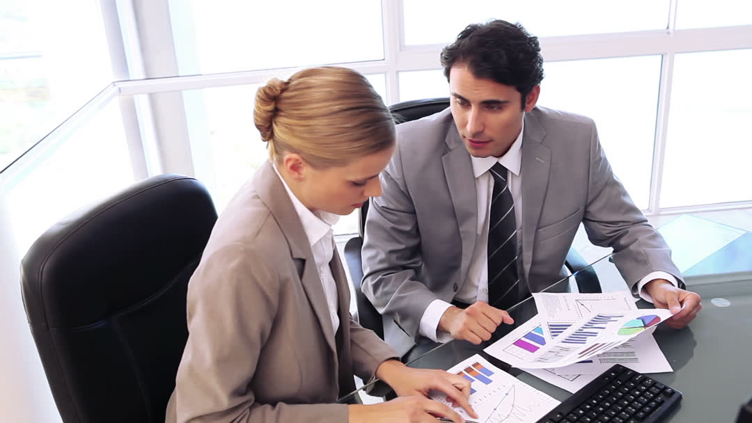 Two businesspeople seated at a glass table are actively engaging in analysis of printed financial charts and graphs. The bright and modern office provides a clear and organized setting indicating a formal work environment. This video is ideal for illustrating concepts of business meetings, teamwork, data-driven decision making, economic analysis, corporate office environments, reports, professional work environments, and business consultancy services.