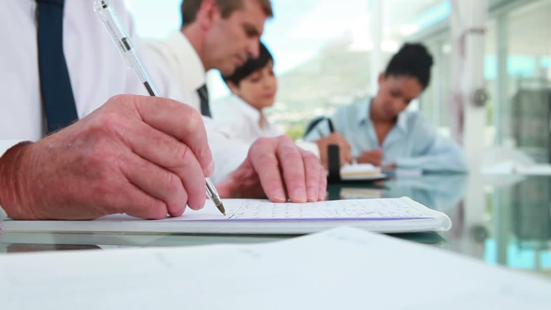 Hands write notes in notebook during business meeting at an office table with engaged colleagues in background. This visual embodies teamwork and effective collaboration, ideal for illustrating corporate settings, business education materials, articles on professional communication, as well as advertisements promoting office supplies or teamwork strategies.