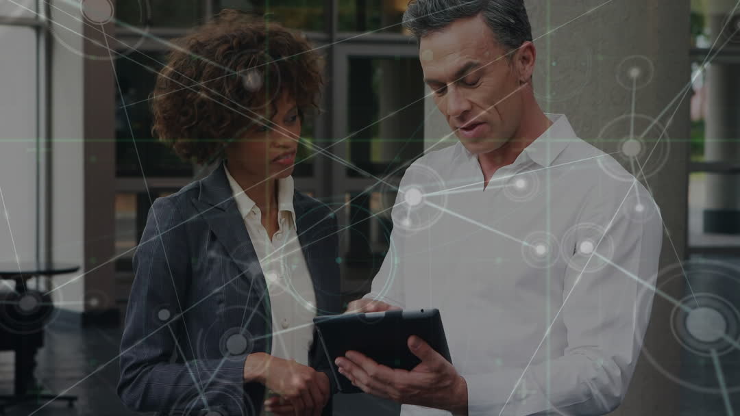 Two professionals are collaborating with a digital tablet against a backdrop of networking graphics. Suitable for illustrating themes of modern business networking, diverse teamwork, and digital technology integration in corporate environments.