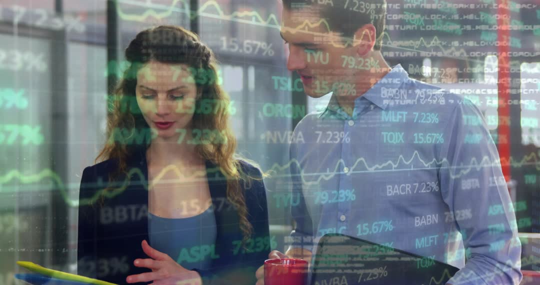 Professionals Discussing Financial Data with Digital Overlay Video