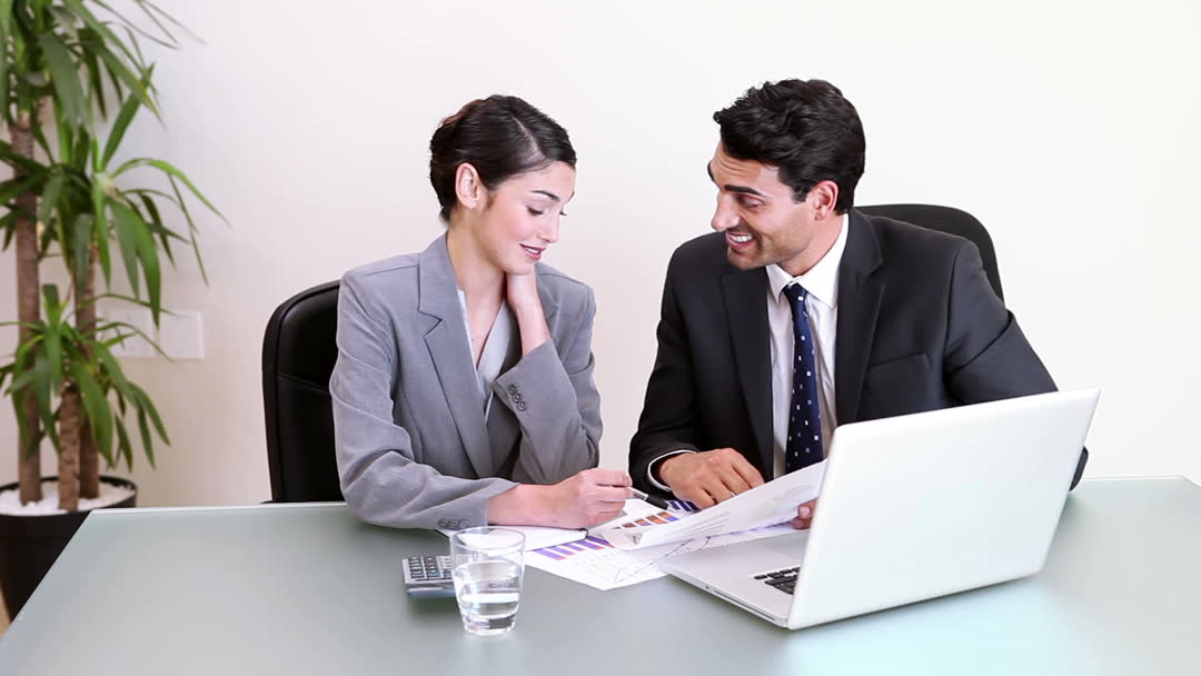 Two business professionals are collaborating in a bright office space. Both individuals are focused on a report or chart displayed on a laptop. Their attire, professional suits, suggests the context of a corporate meeting or an important discussion. A plant's presence in the background adds a touch of natural serenity to the workspace. Ideal for illustrating workplace collaboration, business analysis, or a corporate environment.