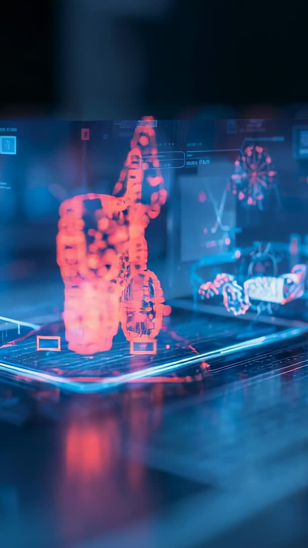 AI Generated Image. Showing vertical tech video of holographic wireframe model rising from tablet on lab desk with rotating wheel spokes and layered UI panels. Featuring neon blue and red palette and shallow depth for dramatic futuristic mood. Focusing on projection interaction, HUD overlays, and 3D data visualization while background monitors display additional schematics. Working well for product demos, app UX presentations, startup promo reels, tech conference openers, industrial design showcases, engineering tutorials. Serving as loop-friendly motion background for social media vertical ads, Instagram Reels, TikTok, mobile app onboarding, or website hero sections. Including usage tips such as cropping safe zones for mobile, adding subtle parallax and ambient sound, and overlaying minimal text or logo for clear call to action.