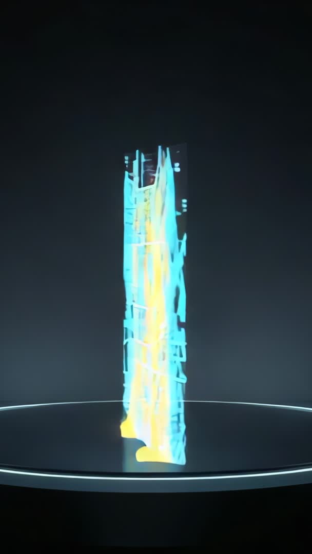 AI Generated Image. Vertical video showing neon blue and yellow street grid projection folding into slim vertical column on curved interactive display. Abstract city map layers animating into stacked translucent grids with glowing pathways and subtle noise. Dark studio background highlighting luminous geometry and reflective circular platform. Cinematic motion graphics emphasizing depth, rotation, layering and smooth easing. Visual mood conveying futuristic, high-tech, exploratory tone. Serving as backdrop for tech presentations, urban planning demos, data dashboard intros, product launch visuals, broadcast graphics, museum exhibits and social media ads. Enhancing website hero sections and keynote slides with looping motion and ambient glow. Working well for branding spots, UX walkthroughs, AR/VR demo reels, architectural visualizations and motion design showreels. Clip formatted for vertical 9:16 playback, loop-friendly, color-grade ready, supports overlaying text and logos, compatible with Premiere Pro and After Effects workflows.