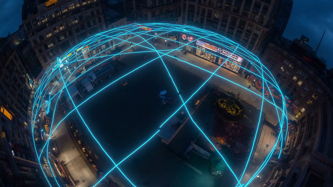 AI Generated Image. Video showing aerial fisheye footage of projector activating luminous blue grid dome mapping urban plaza at dusk. Camera panning slowly while neon grid lines sweep across square, pedestrians wearing coats moving beneath dome, storefronts and kiosks glowing along perimeter. Visual combining urban architecture, cinematic blue lighting, and geodesic projection for futuristic mood. Footage offering wide establishing shot with strong negative space inside dome for text or lower-third overlays. Use for technology presentations, smart city concepts, projection mapping demos, festival promotion, film and TV establishing shots, architectural visualization, and advertising for event production or experiential design. Ideal for background loops, hero banners, lecture slides, news segments about urban innovation, and social media clips. Recommend color grading to enhance neon contrast and optional slow motion editing for dramatic emphasis. Note: AI-generated visual elements present.