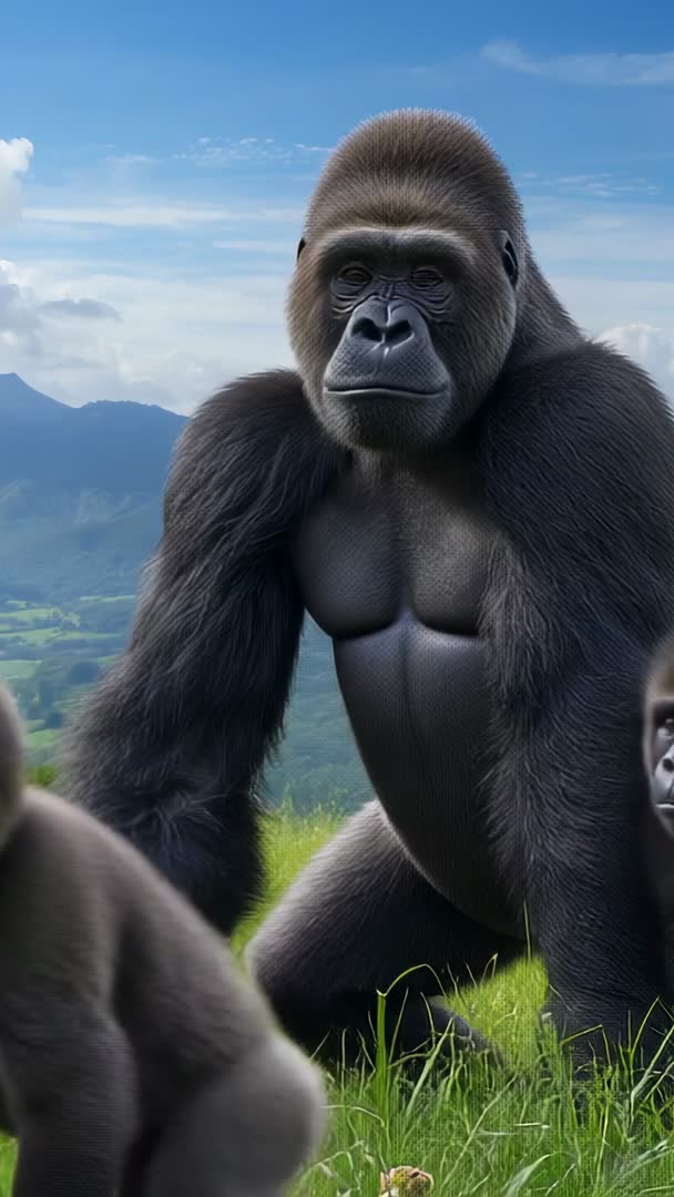 AI Generated Video. Vertical footage showing adult silverback gorilla protecting and tracking juvenile moving through grassy hillside with mountain valley in background. Close-up perspective highlighting muscular torso, textured fur, and calm attentive expression while younger primate moves left through meadow. Soft distant peaks and wildflowers adding scenic context and sense of scale. Use for wildlife documentaries, conservation campaigns, educational clips, social media reels, mobile-first ads, and editorial features about primates or endangered species. Ideal as B-roll for nature stories, opener for environmental videos, hero visual for eco-tourism promotion, or classroom material for biology and animal behavior lessons. Colorful, cinematic, and emotionally resonant footage suitable for both commercial and editorial licensing.