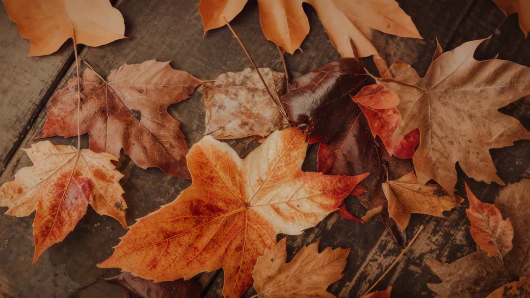 AI Generated Image. Camera pulling back to reveal clustered maple leaves resting on worn wooden planks, showcasing warm orange and brown tones, crisp leaf veins and weathered wood grain. Gentle pull-back movement creating cinematic reveal with strong foreground detail and soft vignette. Composition working well for seasonal intros, autumn sale promos, website hero backgrounds, social media reels, lifestyle b-roll, product overlays, greeting card animation and mindfulness loops. Color palette providing cozy fall atmosphere for branding, packaging, editorial and digital content. Clip delivering seamless loop potential and ample negative space for overlaid text, headlines or logos.
