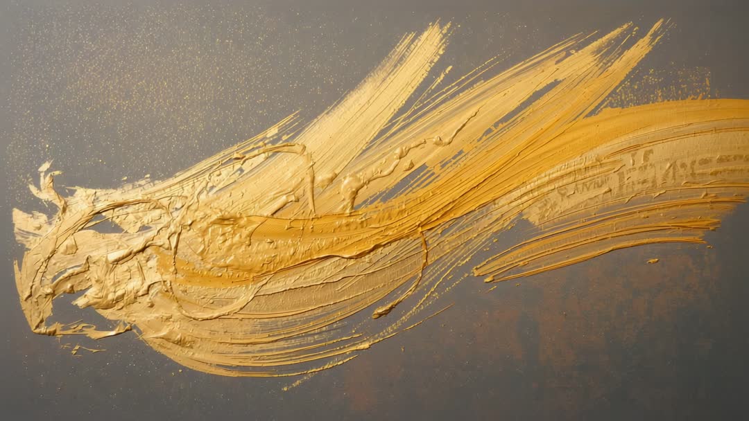AI Generated Video. Pulling back camera revealing sweeping metallic gold brushstroke moving across dark gray canvas, showing layered impasto, ridged brush marks, and subtle glittering pigment. Shot delivering rich tactile detail and slow-motion-friendly motion, suiting title backgrounds, product promos, luxury packaging animations, art documentary sequences, gallery projections, and social media hero clips. Layering with text overlays and color grading to warm tones enhancing visual impact. AI-generated abstract art offering versatile creative asset for designers, filmmakers, and advertisers.