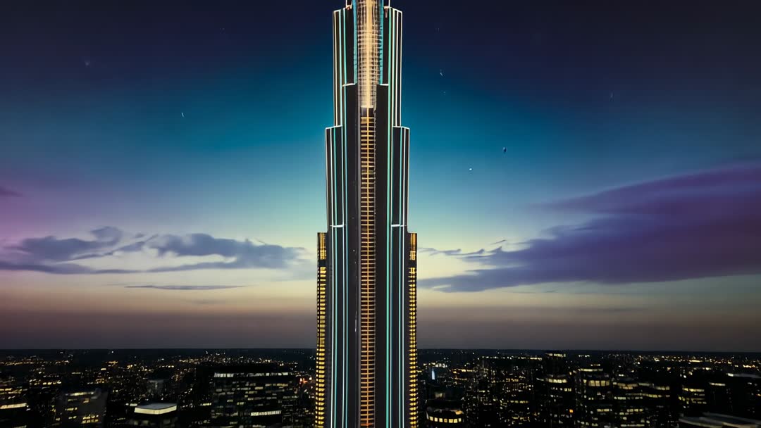 AI Generated Image. Showing cinematic pullback movement revealing neon-outlined skyscraper rising above urban skyline at dusk. LED strips accentuating vertical lines and glass façade while city lights sparkling across horizon and twilight sky shifting from teal to violet. Composition centering on tower with spire initially in focus, then revealing wider metropolitan panorama and distant city grid. Ideal for technology promos, corporate openers, real estate showcases, urban planning presentations, travel commercials, sci-fi title sequences, website hero backgrounds, and broadcast lower thirds. Editing suggestions: extend clip with slow zoom or speed ramp, add subtle lens flares and film grain, enhance teal-violet contrast with color grading, and overlay animated text or infographics for branding. Technical notes: wide panoramic framing fits 16:9 and ultrawide crops, strong vertical element useful for split-screen or vertical social formats, and high-contrast lighting supporting HDR grading.