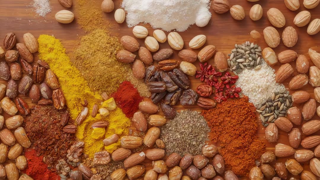 AI Generated Image. Showing camera pulling back, revealing full nut and spice layout arranged on rustic wood board with piles of salt and mixed seeds. Featuring vibrant piles of turmeric, paprika, ground cumin, sesame and sunflower seeds alongside whole almonds, pecans, peanuts, pistachios and chopped nuts for texture. Capturing top-down flatlay composition with strong color contrast and tactile surfaces, creating eye-catching visual for culinary storytelling. Working well for cooking video intros, recipe tutorials, spice shop promos, grocery packaging, social media reels, blog headers and cookbook b-roll. Providing easy cropping for thumbnails and closeups for product detail shots. Suggesting overlay text for recipe names, ingredient lists or promotional offers and supplying copy space along board edge for branding and logo placement. Color palette focusing on warm yellows, deep reds, toasted browns and natural wood tones. Licensing suitable for commercial and editorial projects.