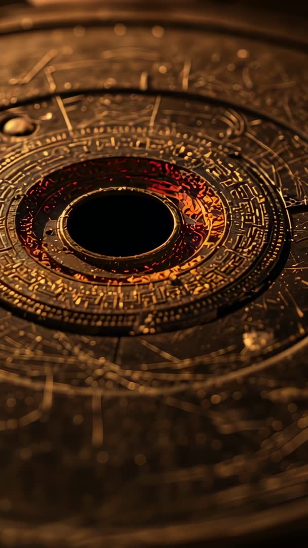 AI Generated Image. Pulling back camera to reveal ornate metallic disc with crimson groove and concentric rings. Warm studio lighting highlighting embossed details and metallic texture. Macro focus creating shallow depth of field with soft bokeh and dramatic contrast. Evoking mystery, ancient artifact, and high-end craftsmanship. Recommended uses include title opener for cinematic trailers, mystery or sci-fi sequences, luxury brand intros, museum exhibit promos, watch or jewelry product reveals, cryptocurrency or blockchain concept visuals, and vertical ads or social media reels. Looping short clip working well for motion backgrounds behind minimal typography or logo overlays. Color grading suggestion: enhance warm gold highlights and deepen shadows to increase contrast. Adding slow motion and subtle vignette amplifying dramatic feel. Leaving outer rings clear for on-screen text and lower-third placement.