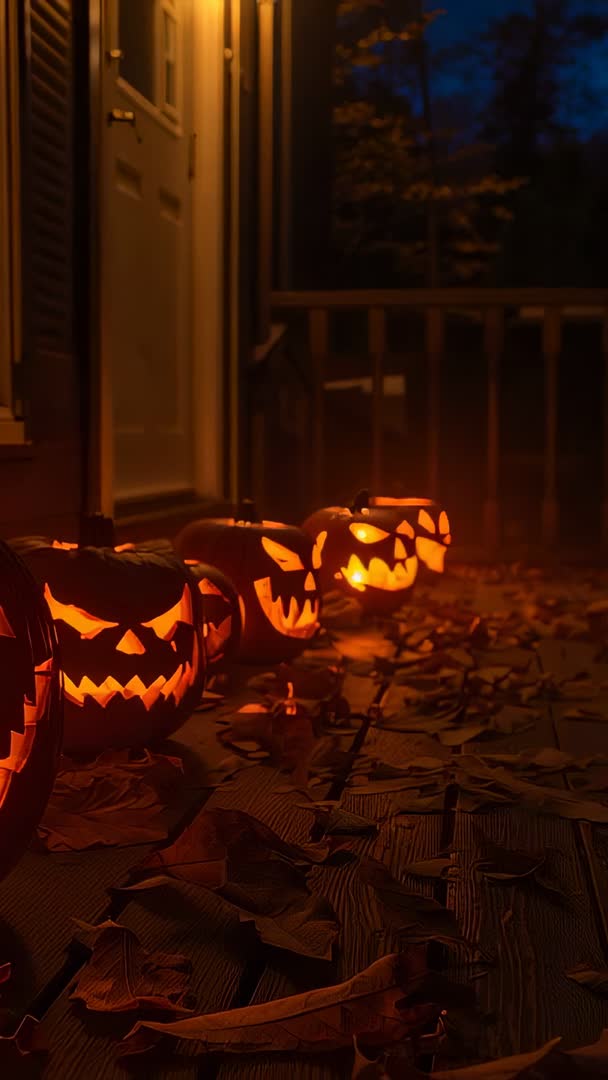 AI Generated Image. Showing camera pulling back to reveal row of three carved jack-o'-lanterns glowing on porch at dusk, candlelight flickering through carved faces. Autumn leaves scattering across wooden deck adding texture and seasonal mood against deep blue night sky. Featuring warm orange glow contrasting with cool background for cinematic, moody atmosphere. Ideal for Halloween marketing, social media vertical ads, Instagram Reels, TikTok clips, event promos, haunted house trailers, seasonal blog headers, ecommerce product displays, greeting card animations, and holiday invitation videos. Leaving upper frame dark for overlay text or logo and providing ready-made scene for title cards, lower thirds, or quick cuts. Useful for storytellers creating suspenseful intros, retailers promoting fall decor, and designers building Halloween-themed layouts.