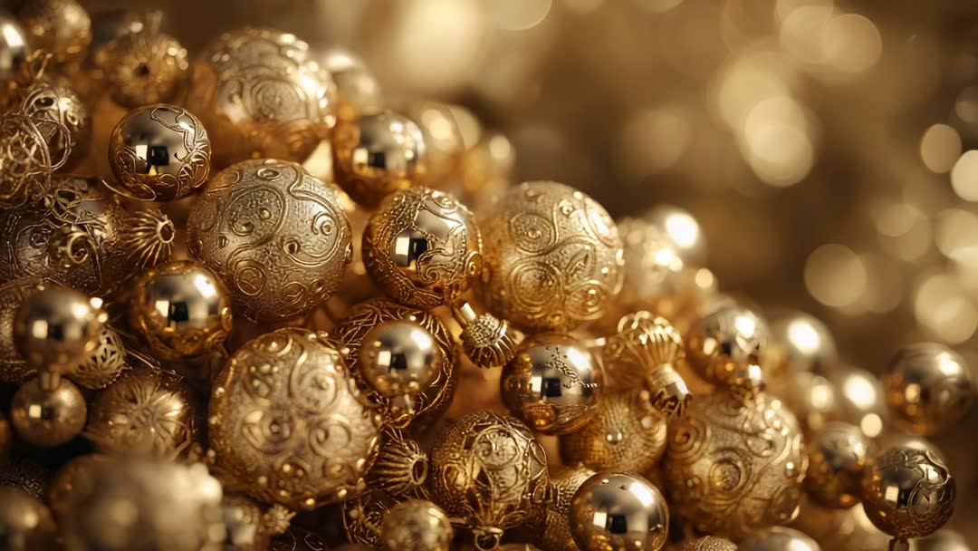 AI Generated Video. Pulling-back clip revealing dense cluster of ornate gold baubles, combining reflective spheres and embossed ornaments with warm golden bokeh. Close-up macro framing showing detailed texture, intricate patterns, and mirror highlights reacting to studio lights. Slow camera movement creating cinematic reveal and depth, soft-focus background producing elegant shimmer. Usage ideas: - Using as hero loop for luxury holiday landing pages and ecommerce banners - Using as opener for seasonal commercials, gift-guide videos, product promos - Using as background for social media reels, Instagram stories, festive ads - Using as overlay for text or logo reveal, leaving negative space for lower-third captions - Using for packaging videos, event invitations, lifestyle montages and mood reels Production notes: - Shooting with shallow depth of field and controlled studio lighting - Optimizing warm color grading to enhance golden tones - Working with 4K timelines and slow-motion editing
