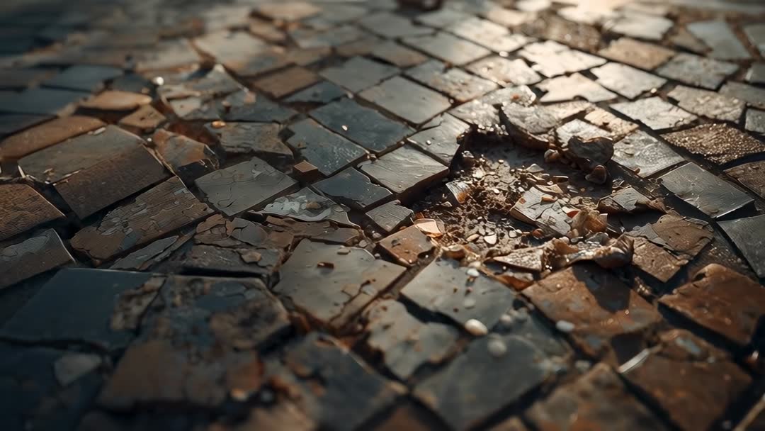 AI Generated Image. Pulling back across cracked mosaic tiles, revealing loose fragments, chips, and pooling moisture caught between tesserae. Capturing warm golden hour light creating reflective highlights on wet surfaces and casting long soft shadows. Focusing on shallow depth of field, emphasizing texture, broken edges, and grout gaps while background falling into soft blur. Presenting gritty, cinematic mood suitable for urban decay, restoration, and architectural detail storytelling. Offering high-detail close-up motion clip ideal for documentaries, commercials, editorial features, and design projects. Recommending uses: background texture for motion graphics, hero clip for renovation or preservation campaigns, tutorial footage for tile repair, website hero banner, social media loop, and stock footage libraries. Framing tips: retain low-angle wide crop for cinematic impact or tight macro crop for abstract texture studies. Color grading suggestions: preserve warm orange highlights, boost local contrast to emphasize cracks, apply subtle film grain for atmospheric feel.