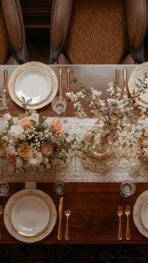 AI Generated Video. Vertical video pulling back from overhead view, revealing elegant wooden dining table topped with lace runner, floral centerpiece, eucalyptus sprigs and gold cutlery. Showcasing delicate china, crystal glassware and warm wood tones for wedding, dinner party, hospitality and home decor projects. Featuring slow reveal edit with soft instrumental music, close-up pans of blooms and cutlery, overlay text for menu or RSVP and color grading to enhance cozy elegant mood. Cropping for portrait thumbnails or 16:9 hero shots, adding logo and call-to-action for catering, venue or tableware promotions, using for social media reels, website banners and editorial content.