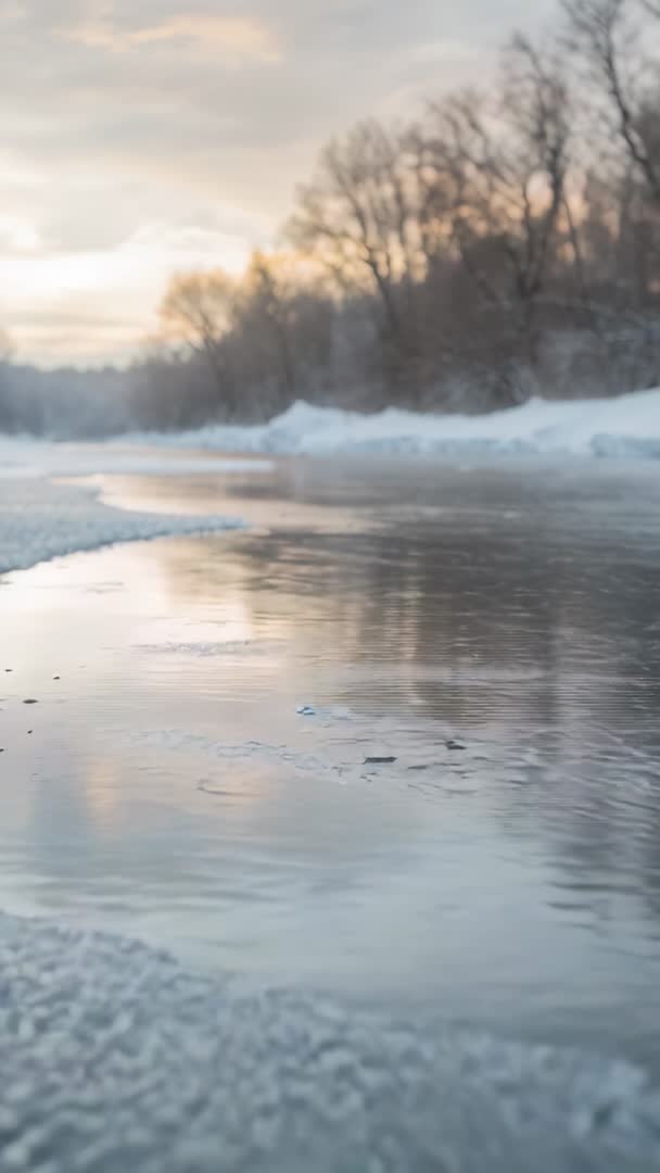 AI Generated Video. Pulling back to reveal frozen river flowing beneath thin sheet of ice along snowy bank, showing textured ice crystals and subtle water reflections of pastel sunrise sky. Bare trees standing in silhouette along distant riverbank, creating calm tranquil mood and soft depth. Foreground showing detailed ice ridges and glossy melt pools, midground reflecting warm morning light and cool winter tones. Video working well for mobile vertical formats and cinematic b-roll. Serving well for social media vertical ads, mobile lock screens, relaxation and meditation content, winter travel promotions, environmental storytelling, blog headers, website hero sections, calming background for product launches, seasonal greeting visuals, or broadcast nature segments.