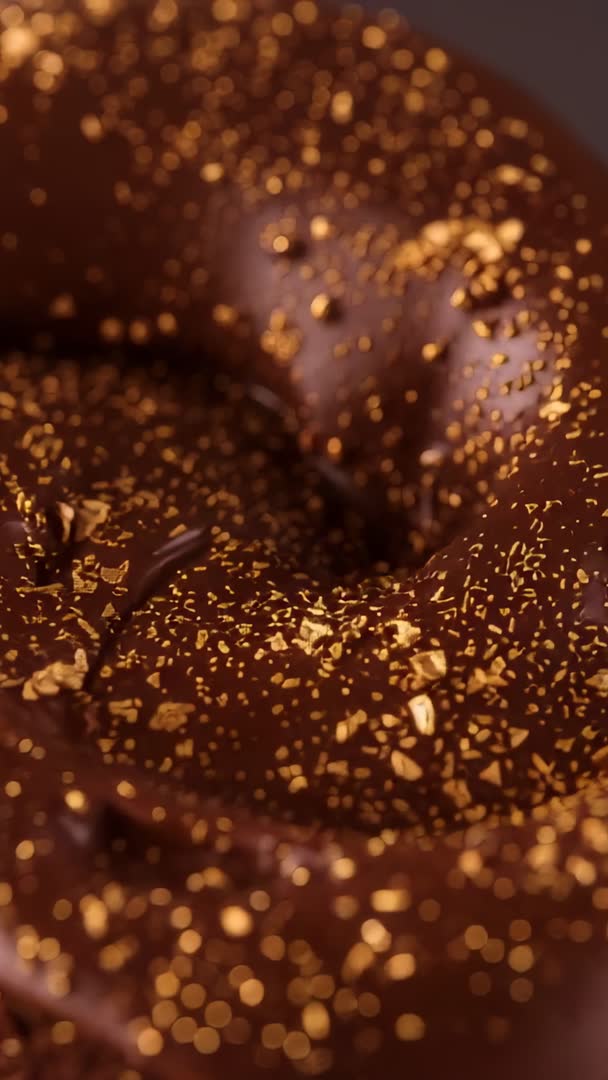 AI Generated Video. Vertical macro video revealing glossy chocolate donut sprinkled with edible gold flakes and fine chocolate streak, camera pulling back to showcase rich glaze texture and sparkling bokeh. Featuring studio lighting, shallow depth of field, warm highlights and mouthwatering close-up detail. Suitable for gourmet dessert advertising, luxury bakery branding, social media reels and vertical ads, recipe reels, menu display loops, product packaging animations and culinary blog hero clips. Compatible with slow-motion edits, looping backgrounds, close-up transitions and color grading to enhance gold shimmer. Evoking indulgence, decadence and premium handcrafted confectionery, leaving space for headline or logo overlay at top or bottom of frame.