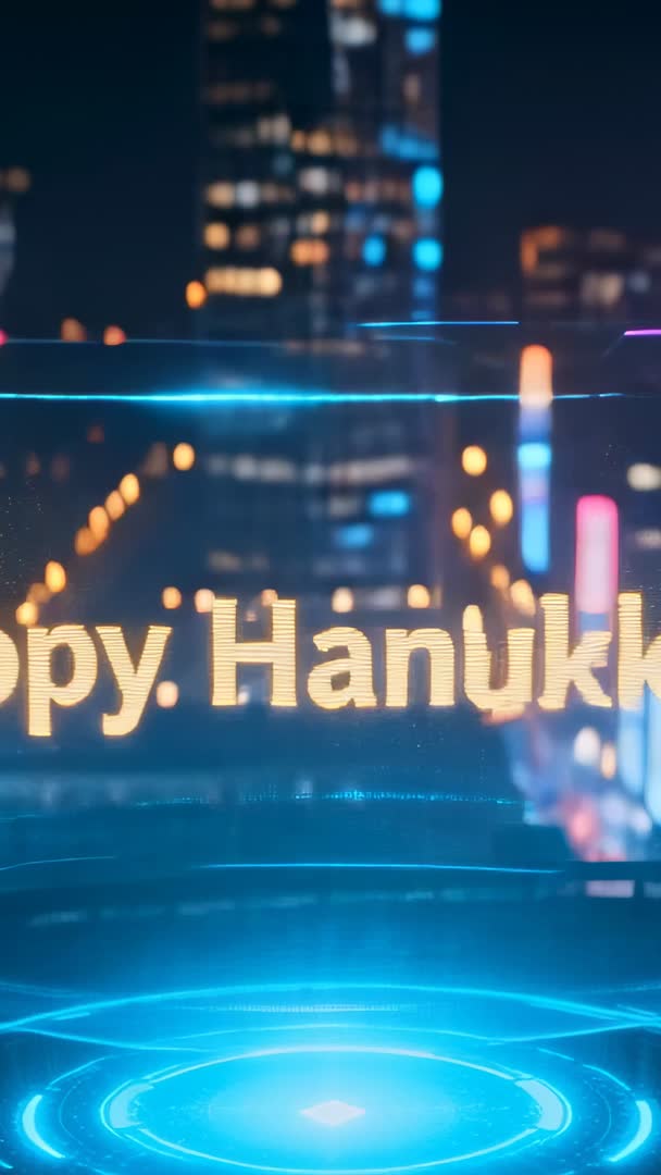 AI Generated Image. Pulling back, revealing gold Hanukkah text floating above rooftop while magenta holographic rings rise and rotate over neon city night. Foreground showing blue holographic platform with concentric light rings and background bokeh lights creating cinematic depth. Color palette combining warm gold with cool blue and magenta for modern festive contrast. Ideal for mobile vertical video campaigns, Instagram Reels, TikTok stories, digital greeting cards, event promos, synagogue or community center announcements, holiday countdowns, rooftop party intros. Editable text layer allowing custom greeting or branding. Loopable motion making continuous background for livestreams or screen signage. Suitable for UHD vertical 9:16 format, short-form video ads, motion graphic overlays; pairing with soundtrack or voiceover enhancing festive message.