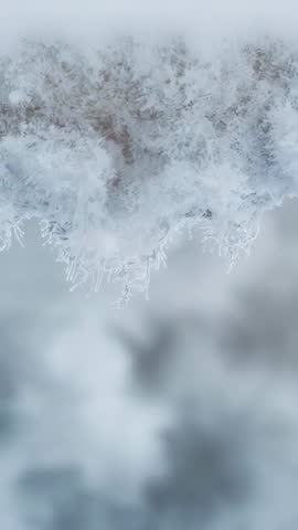 AI Generated Video. Pulling back camera revealing frost-coated twig with delicate needle hoarfrost crystals and intricate ice formations. Macro closeup focusing on crystalline textures, shallow depth of field creating soft bokeh background in cool blue tones. Vertical orientation optimized for mobile platforms such as Instagram Reels, TikTok, Stories. Useful for winter-themed content, seasonal advertising, environmental storytelling, nature documentaries, scientific explainer about frost formation, holiday marketing, background for calm intros or product showcases. Clip works well as looping background, title reveal, or text overlay area in lower third. Recommend slow motion playback, gentle color grading to enhance icy blues, and adding subtle ambient music for meditative mood.