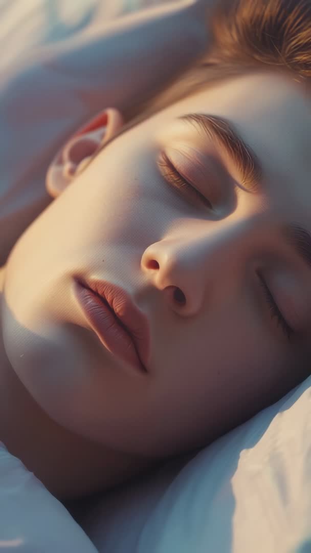 AI Generated Image. Vertical video showing gradual pullback revealing sleeping teen resting on pillow in warm morning light. Closeup capturing face, closed eyelids, soft breathing, slightly parted lips, tousled hair and visible ear with gentle cinematic highlights. Mood conveying calm, innocence and intimate quiet moment, suitable for emotional B-roll. Use for sleep wellness campaigns, mattress and pillow advertising, guided meditation and relaxation apps, teen health and lifestyle stories, beauty and skincare commercials, social reels and vertical ads. Pair with ambient music, soft voiceover or slow cinematic cuts to emphasize tranquility; crop for portrait mobile formats while preserving emotional focus.