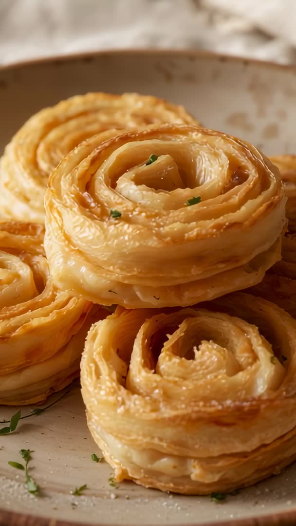 AI Generated Video. Vertical video showing close-up pull back revealing stacked flaky puff pastry spirals with golden, crispy layers. Shot highlighting delicate lamination, buttery sheen, and layered texture for strong visual appetite appeal. Ideal for social media reels, recipe tutorials, bakery advertising, menu visuals, and culinary blogs. Use with slow motion or macro reveal to emphasize flakiness and layering. Add upbeat music, voiceover narration, or on-screen recipe steps for recipe demonstration. Crop for mobile thumbnails and overlay logo or price tag for promotional content. Color grade for warm tones to enhance golden crust. Provide short loopable clip for hero banner, intro, or product spotlight. Include ingredient callouts or subtle text animations to increase engagement.