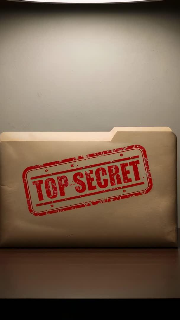 AI Generated Video. Camera pulling back in vertical frame to reveal manila folder stamped TOP SECRET resting on polished desk under warm lamp spotlight. Composition using negative space above folder to create tension while soft shadowing and muted wall color adding moody, cinematic feel. Folder bearing distressed red stamp suggesting confidential, classified contents and investigative narrative. Useful for titles, intros, or transitions in thriller trailers, corporate security presentations, data protection videos, investigative journalism segments, and social media short-form ads. Video leaving room for overlay text, logos, or lower-third graphics when used as hero background for landing pages or vertical ad campaigns. Color palette and minimal props allowing easy color grading and caption placement. Suitable for editorial, commercial, and promotional projects focused on secrecy, security, or mystery.