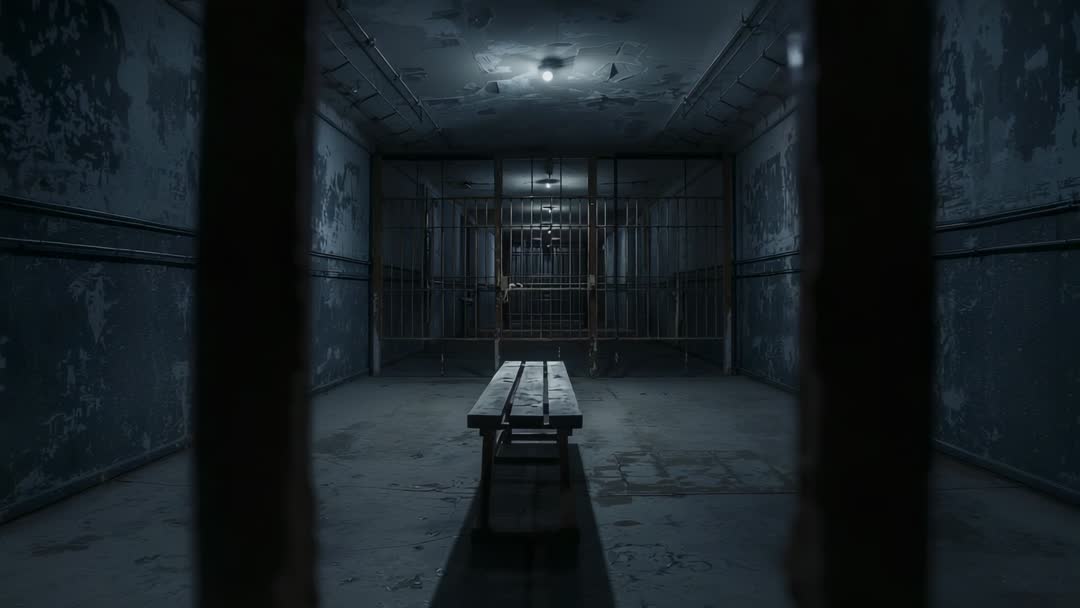 AI Generated Image. Showing camera pulling back to reveal solitary bench centered in dim, dilapidated holding cell with peeling paint, rusted bars, stained concrete floor, overhead bulb casting long shadows. Creating moody, suspenseful atmosphere suitable for crime drama, thriller, horror, documentary about incarceration, urban exploration content. Working well as establishing shot, B-roll insert, title sequence background, dramatic cutaway for trailer or podcast cover. Suggesting post-production treatments such as adding ambient echoing footsteps, low rumbles, slow zoom stabilization, deep cold color grade, film grain, and overlay text for opening credits. Recommending use for social issue campaigns, prison reform documentaries, game environment references, location scouting moodboards, and atmospheric commercial spots.