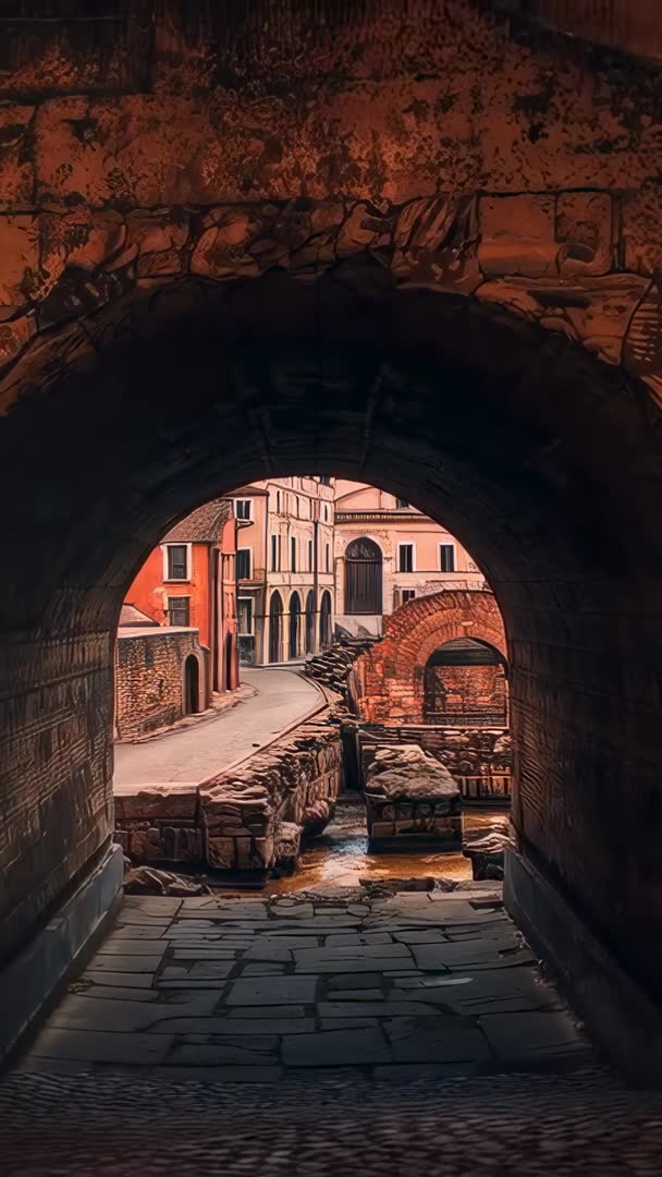 AI Generated Video. Vertical video showing camera pulling back through weathered stone arch, framing narrow canal lane with cobblestone pavement and pastel facades. Foreground featuring textured stone carvings and shadowed arch interior, midground revealing small brick bridge and shallow water channel, background presenting rows of arched windows and historic building fronts. Warm color palette with terracotta and ochre tones creating cinematic, intimate mood. Footage suiting travel promos, destination marketing, social media reels, and cultural heritage features. Working well as opening shot in travel vlogs, mobile ad campaigns, website hero clips, museum exhibit displays, and guided tour apps. Easy to edit for slow pull-back effect, color grading, overlay text, and logo placement in safe zones. Vertical aspect ideal for smartphone consumption and short-form video platforms.