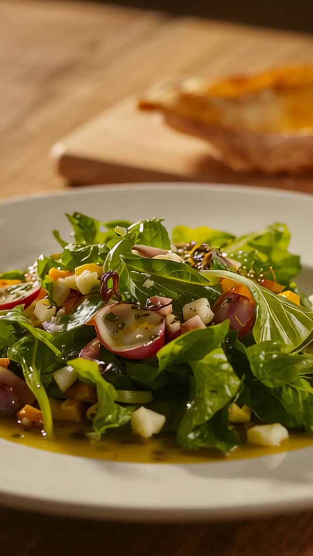 AI Generated Image. Vertical food video pulling back from close-up featuring arugula and mixed greens with grapes, diced cheese, seeds and glossy vinaigrette on wood table, revealing rustic bread in background. Warm natural light and shallow depth of field creating appetizing shine on dressing and crisp leaf texture. Camera movement adding cinematic reveal and framing, ideal for short-form content. Usage ideas: using as intro clip for cooking tutorial, showcasing menu items for restaurant reels, promoting healthy eating on social channels, illustrating recipe steps in blog or app, adding B-roll to commercial food ads, enhancing magazine layouts or food packaging presentations. Footage pairing well with upbeat acoustic music, on-screen recipe text, or voiceover narration. Technical notes: vertical 9:16 aspect, close-up composition, gentle pull-back motion, high-resolution, color-balanced to emphasize greens and warm wood tones.