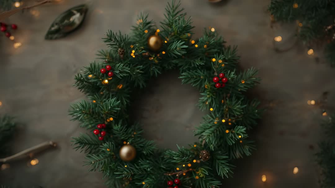 AI Generated Video. Close-up video clip showing camera pulling focus onto evergreen wreath with red berries, gold baubles, and warm fairy lights. Soft bokeh background creating cozy, rustic holiday mood while leaving space for headline or logo overlay. Serving as intro or transition shot for lifestyle content, craft workshops, home decor showcases, and e-commerce hero clips. Ideal for holiday marketing, social media reels, seasonal website banners, DIY wreath tutorials, gift guide videos, product promotions, and greeting card animations. Color palette featuring deep evergreen, warm gold, and bright red for strong festive contrast. Frame allowing center copy placement or animated text around wreath ring.