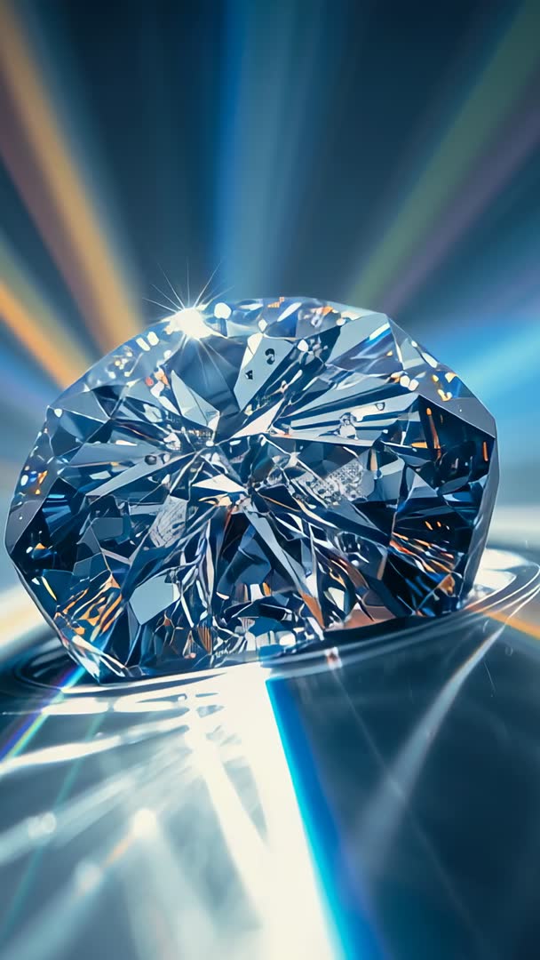AI Generated Image. Vertical slow pulling shot showcasing brilliant diamond resting on curved reflective base while refracting colorful beams and producing starburst highlights. Footage fitting luxury jewelry commercials, product reveal sequences, hero banners for e-commerce, vertical social media ads, app splash screens, title intros for fashion videos, and promotional reels. Footage working well as background loop under text overlays, motion graphic transitions, or educational clips explaining light dispersion and gem cutting. Recommending color grading toward cool blue tones, adding subtle vignette and gentle lens flare, and leaving safe space at top and bottom for captions and logos. Suggesting editing into short 6-15 second hero clips or extended slow-motion reveal for cinematic sequences. Metadata helping optimize search visibility for luxury, gemstone, diamond, prism, sparkle, and jewelry markets.