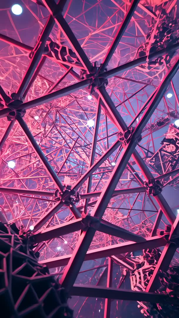 AI Generated Image. Vertical clip showing camera pulling away from joint, turning through geodesic dome, revealing inner mesh and intersecting rods lit by neon pink and purple LEDs. Featuring metallic lattice, node connectors, and reflective surfaces creating abstract, futuristic atmosphere. Working well for social media reels, music video intros, tech and architecture promos, gallery exhibition highlights, product launch backgrounds, and immersive event loops. Offering portrait 9:16 aspect, smooth camera movement, and clear focal points for title overlays and motion graphics. Suggest looping by matching start and end frames, adding subtle speed ramping, and pairing with synth or ambient soundtrack for cinematic impact.