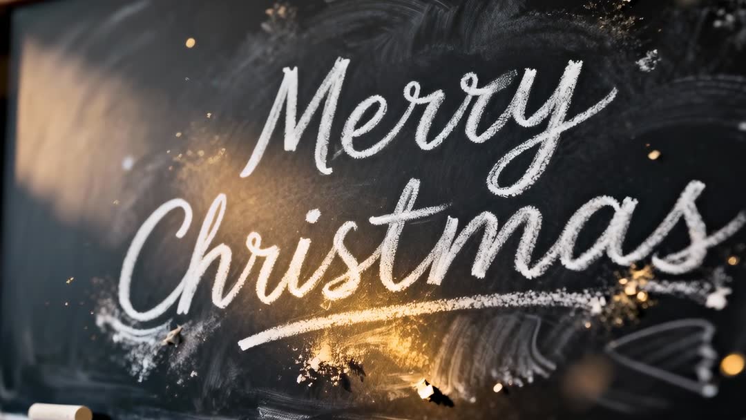 AI Generated Video. Short cinematic clip showing camera pulling focus to chalkboard message Merry Christmas, revealing hand-drawn chalk script while dust particles catch warm backlight and create glowing bokeh highlights. Close-up shallow depth of field creating cozy, handmade holiday mood with rustic slate texture and chalk smudges. Ideal for hero background on holiday website, social media promo, greeting card animation, store window loop, TV commercial opener, seasonal email header, and product packaging preview. Easily customize by adding text overlay, logo, animated snowfall, color grade to match brand palette, or subtle motion graphics for extended intro. Works well looped for in-store displays, greeting screens, and short ad spots. Mood suggestions: warm, nostalgic, handcrafted, festive, inviting.