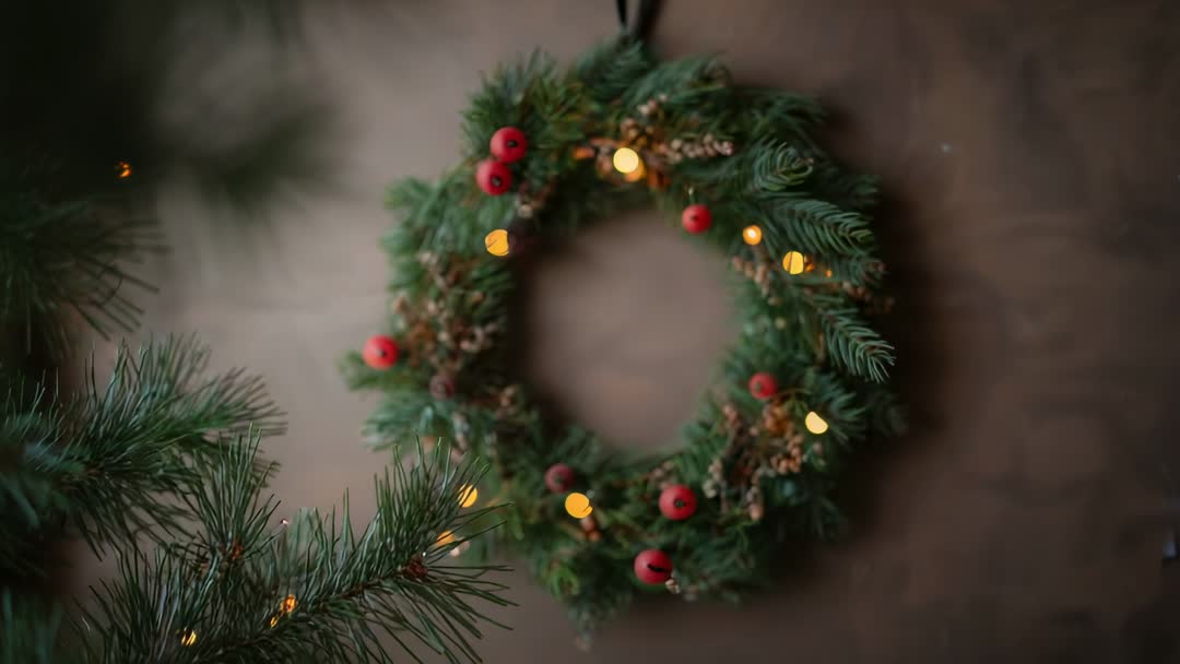 AI Generated Video. Showing pull focus from foreground pine branch to wreath on wood wall, with warm lights creating bokeh and cozy mood. Featuring evergreen wreath decorated with red berries and tiny string lights, rustic wood backdrop, soft shallow depth of field. Working well for holiday video openers, social media reels, website hero banners, seasonal product promos, greeting card animations, lifestyle commercials. Offering loopable close-up footage for festive overlays, title reveals, background for recipe or craft tutorials. Supplying 4K-ready composition with cinematic depth and warm color palette.