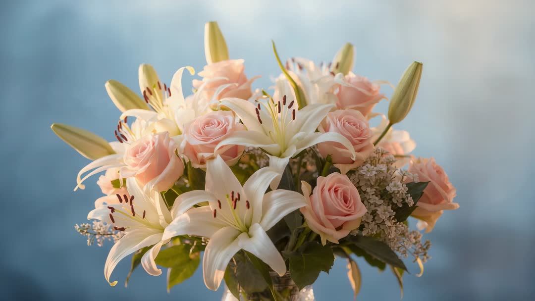 AI Generated Video. Pulling in slow dolly on tabletop bouquet of white lilies and blush roses, warm golden light revealing petal texture and lily stamens. Showing soft blue bokeh background providing calm contrast to pastel blooms. Working well as opening b-roll for wedding films, florist commercials, romantic product ads, and lifestyle social content. Supporting hero banners, greeting card animations, floral shop websites, and print layouts for event invitations. Offering easy color matching with pastel palettes and warm highlights; suggesting gentle slow motion, 24–60 fps, and soft fade transitions for cinematic feel. Recommending close crop for hero frame or wide frame for editorial spread; leaving negative space on right for title overlays or lower-third text. Suitable for stock reels, background loops, floral arrangement tutorials, and promotional clips for seasonal campaigns.