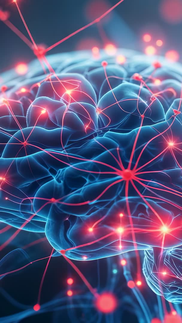 AI Generated Image. Depicting pulsing neural connections across 3D brain model with glowing red synapses and electric blue cortical folds. Showing dynamic signal transmission, network connectivity, and synaptic firing for visualizing cognitive processes and data flow. Suiting opener sequences for neuroscience documentaries, background clips for medical presentations, hero headers for AI and machine learning marketing, explainer videos on neural networks, and classroom or conference visuals. Offering vertical orientation optimized for mobile and social vertical video platforms, loopable motion for continuous playback, and high-contrast color palette for overlaying text or graphics. Providing scientific and futuristic aesthetic for editorial, promotional, and educational projects.