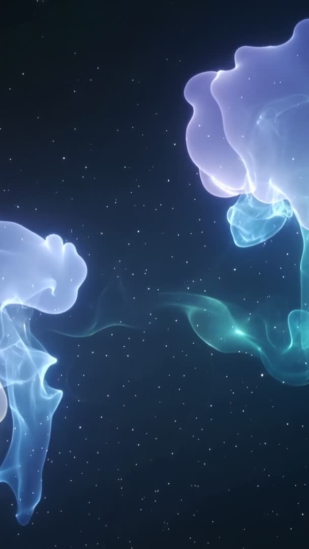 AI Generated Image. Drifting inward across deep starfield, pulsing bioluminescent clouds forming delicate, jellyfish-like filaments and linking wisps. Slow rhythm and soft teal-purple glow creating tranquil, otherworldly atmosphere ideal for ambient visuals. Serving as vertical motion background for mobile wallpapers, social reels, stories, app splash screens, meditation and wellness videos, music visuals, VJ backdrops. Working well with overlaid minimal text, logos, lower-third graphics; recommending soft white or neon cyan typography for high contrast. Supporting seamless looping by matching start and end frames; suggesting moderate color grading to enhance teal and violet tones and subtle particle glow. Providing deliverables such as 9:16 vertical clip, short loop options from 6 to 20 seconds, high-resolution 4K for crop flexibility. Editing tips: experimenting with speed ramping, adding subtle reverb or ambient soundscapes, introducing parallax layers for depth, and applying gentle vignette to focus attention toward central area.