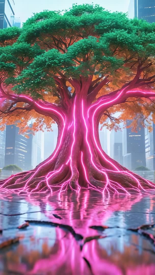 AI Generated Image. Vertical video showing pulsing bioluminescent tree in neon city plaza, glowing pink veins flowing along trunk and roots and reflecting on wet pavement. Green canopy contrasting with orange underleaf, modern glass towers rising in background, soft fog adding depth and scale. Visual mood blending nature and technology, combining organic form with electric illumination for dramatic contrast. Ideal for mobile ads, social media stories, app intros, futuristic trailers, tech conference backdrops, music videos, environmental campaign visuals, and concept art reels. Color palette featuring neon pink, emerald green, warm orange and cool steel blue tones to create high-impact thumbnails. Use suggestions: Looping pulsing animation for vertical formats, adding subtle camera push or slow upward pan, pairing with ambient synth soundtrack or cinematic strings for emotional resonance. Licensing notes: Serving brand campaigns, editorial technology coverage, promotional content and immersive installations.