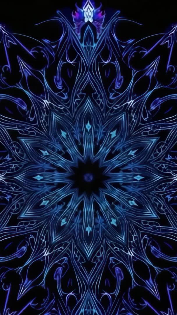 AI Generated Image. Showing pulsing blue fractal mandala on black background, creating rhythmic breathing motion and hypnotic kaleidoscopic loop. Featuring neon blue and purple filaments forming symmetrical starburst and organic petal shapes. Designed for vertical mobile playback, looping seamlessly for reels, stories, and portrait displays. Suiting meditation and mindfulness content, ambient music visualizers, live VJ projections, digital art installations, and relaxation videos. Allowing easy overlay of titles, logos, or captions with dark negative space around central mandala. Offering high-resolution vertical format optimized for mobile screens and portrait displays. Providing adaptable color grading and speed control for mood matching and tempo syncing. Delivering calming visual anchor for sleep aids, yoga sequences, guided breathing exercises, and social media campaign assets.
