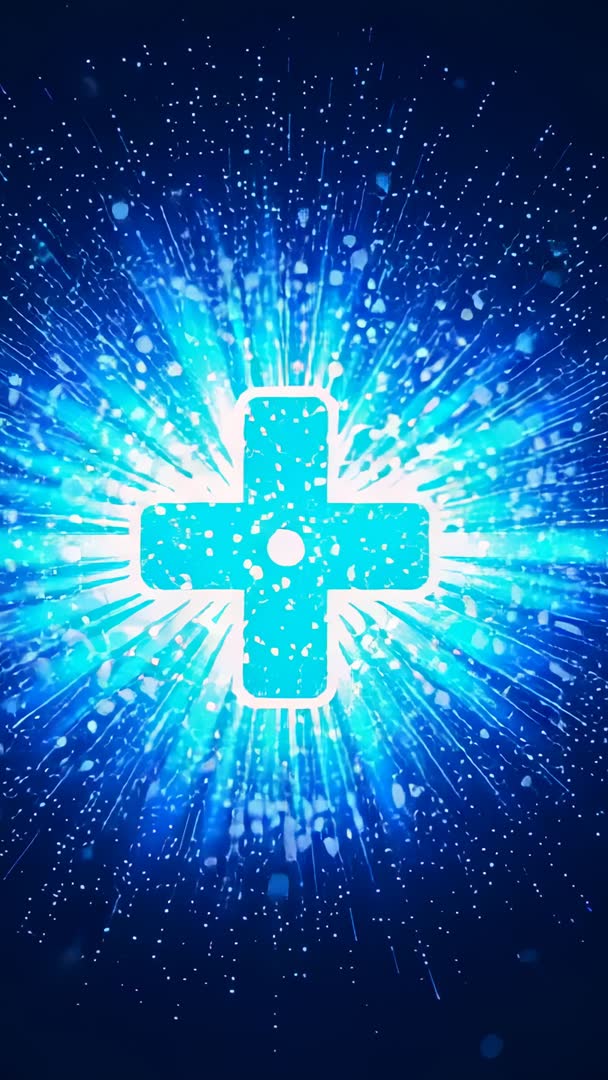 AI Generated Video. Vertical loop video showing pulsing blue plus sign with central core dot, emitting radiant beams and scattering particles across deep navy background. Turquoise glow and starburst sparks creating high-energy visual with cinematic depth and strong focal point. Suitable for logo reveal, app intro, medical technology demo, emergency alert, sci-fi title card, or social media vertical ad. Optimized for Instagram Stories, TikTok, YouTube Shorts, mobile splash screens, broadcast graphics, and presentation opener. Production tips: use as background layer with color grading and particle compositing, add impact sound design and subtle camera shake, overlay vector logo using screen or additive blend, export as looped MP4 at 9:16 aspect for mobile delivery.