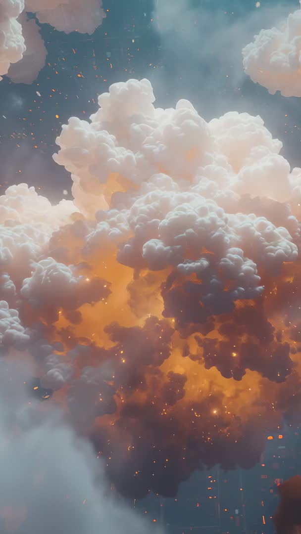 AI Generated Image. Vertical footage showing pulsing cumulus cloud with fiery orange core rising through deep blue sky while ember-like particles drifting outward. Cinematic motion creating dramatic atmospheric moment for title sequences, social media reels, music visuals, trailers, and background loops. Warm glow and soft cloud textures providing high-contrast area for text overlays, logo reveals, and promotional content. Serving as striking VFX element for fantasy scenes, game trailers, weather visualizations, and abstract art projects. Exporting in portrait format making it ideal for smartphone vertical displays, Instagram Stories, TikTok, and mobile ads.