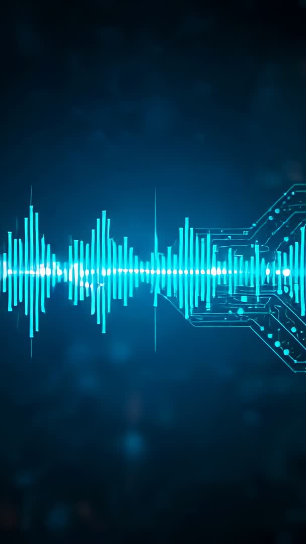 AI Generated Image. Vertical video showing pulsing cyan waveform reacting to audio across central axis, with schematic circuitry lines and small orange nodes adding contrast. Background using deep blue haze and soft bokeh to emphasize glowing waveform and digital circuits. Composition featuring symmetrical center line and mirrored waveform peaks for clean, modern look. Working well for tech promos, music visualizers, app intros, mobile wallpapers, social media stories, streaming overlays, broadcast packages, VJ loops, presentation backdrops, product demos. Motion designers using clip for intro sequences, sound branding, background for on-screen titles and lower thirds. Pairing with electronic or ambient audio enhances impact; applying color grading or chroma shifts allows brand matching; looping producing seamless playback for long-form use.
