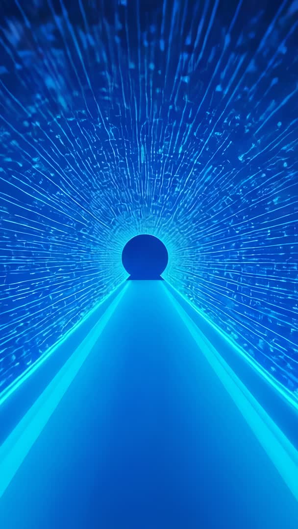 AI Generated Video. Featuring pulsing cyan lane stretching through curved neon tunnel toward glowing circular portal, radial light streaks creating illusion of speed and depth. Vertical orientation optimized for mobile and social platforms. Working well as background loop for tech presentations, product launches, event visuals, DJ VJ sets, music video intros, sci-fi trailers, app splash screens, and social stories. Dominant cyan and blue palette delivering high contrast neon glow. Providing seamless loop potential and strong forward motion for transitions, title reveals, promotional clips. Delivering modern digital tech vibe for branding, UX mockups, website hero headers, and vertical video ads.