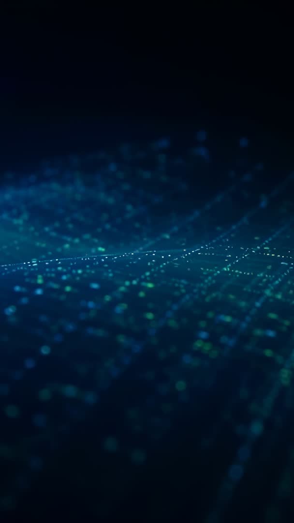 AI Generated Image. Vertical video showing pulsing data grid shifting across cyber plane with glowing blue nodes forming smooth waves and depth. Creating high-tech atmosphere for technology, cybersecurity, data analytics, AI, cloud computing and network infrastructure projects. Working well as motion background for website hero sections, corporate presentations, app intros, product demos, streaming overlays, social media reels, vertical ads. Providing easy customization with color grading, speed ramping, particle glow enhancements for brand storytelling and promotional videos. Delivering cinematic depth and dynamic motion for headlines, title plates, transitions, infographic animations.