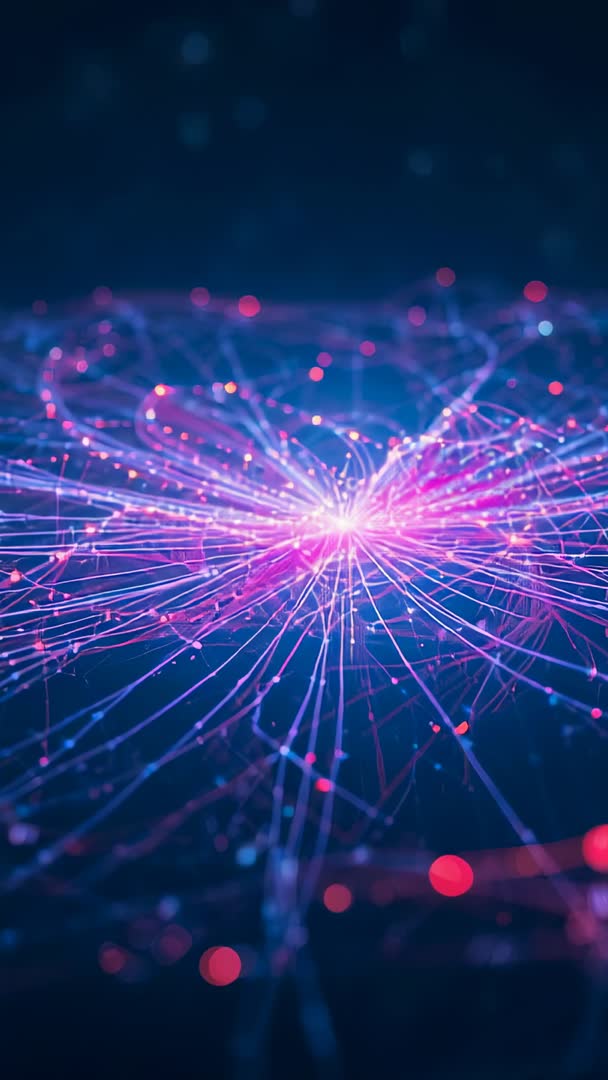 AI Generated Image. Showing pulsing data node sending glowing filaments and scattered data points across dark navy network plane. Featuring neon pink, purple and blue palette with soft bokeh highlights and dynamic depth. Working well for tech presentations, app intros, website hero sections, corporate promos, conference openers, social media vertical ads, live visuals and title backdrops. Providing loop-friendly motion and strong center focal point for overlaying text or logo. Allowing color grading, speed ramping and cropping for portrait mobile screens and cinematic formats. Suggesting themes of connectivity, information flow, neural activity and data transfer for editorial, commercial and branding use.