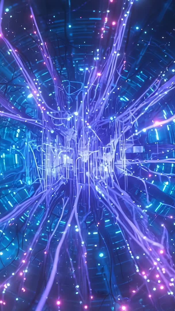 - Pulsing energy core sending neon filaments through deep-blue futuristic tunnel vertical video