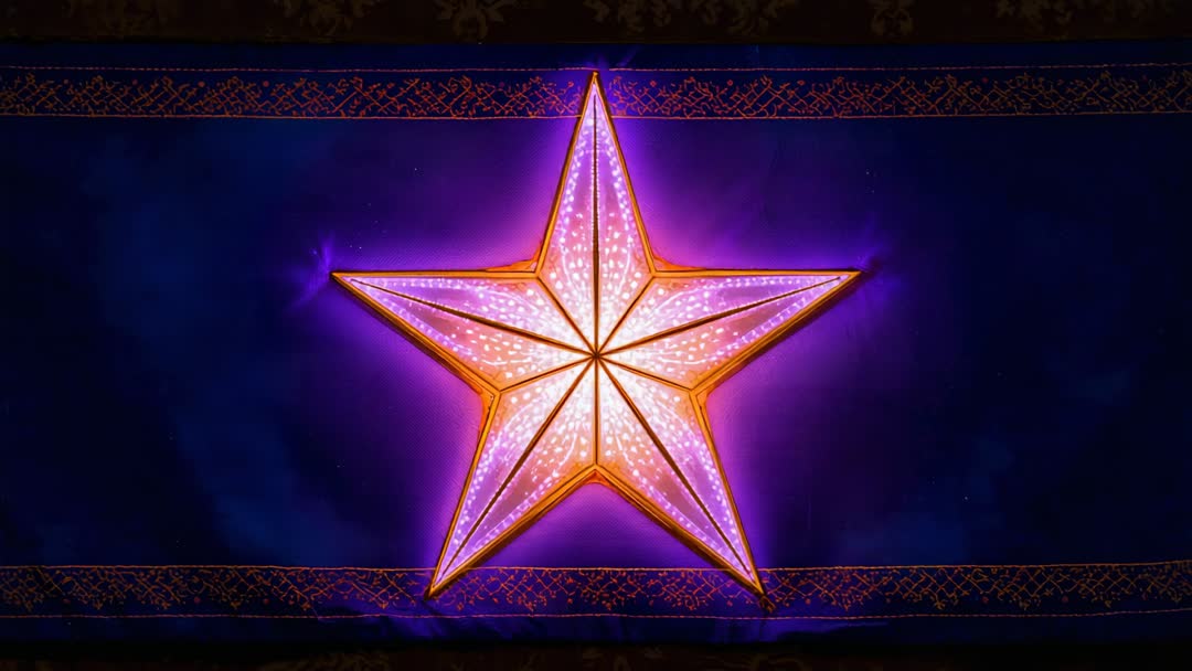 AI Generated Video. Video showing five-point star lantern pulsing with radiant purple halo against deep blue banner. Star featuring gold-edged panels and inner twinkle particles creating shimmer and depth. Timed sequence starting with gentle pulse then building to brighter halo before returning to soft glow, creating seamless loop. Ideal for creating holiday intros, event openers, social media stories, website hero animations, stage projections, and retail displays. Useful for adding elegant festive atmosphere to product promos, livestream overlays, greeting videos, and digital signage. Color palette focusing on deep blue, vivid purple, warm gold, and soft pink highlights. Recommending loop duration 8-20 seconds depending on use; export options including MP4, GIF, animated PNG for cross-platform compatibility. Pairing with ambient synth or cinematic chime music to enhance mood; adjusting brightness and bloom for venue size for best impact. Suitable for high-resolution displays and projection mapping; working well for seasonal campaigns, luxury brand promotions, and event visual identity.