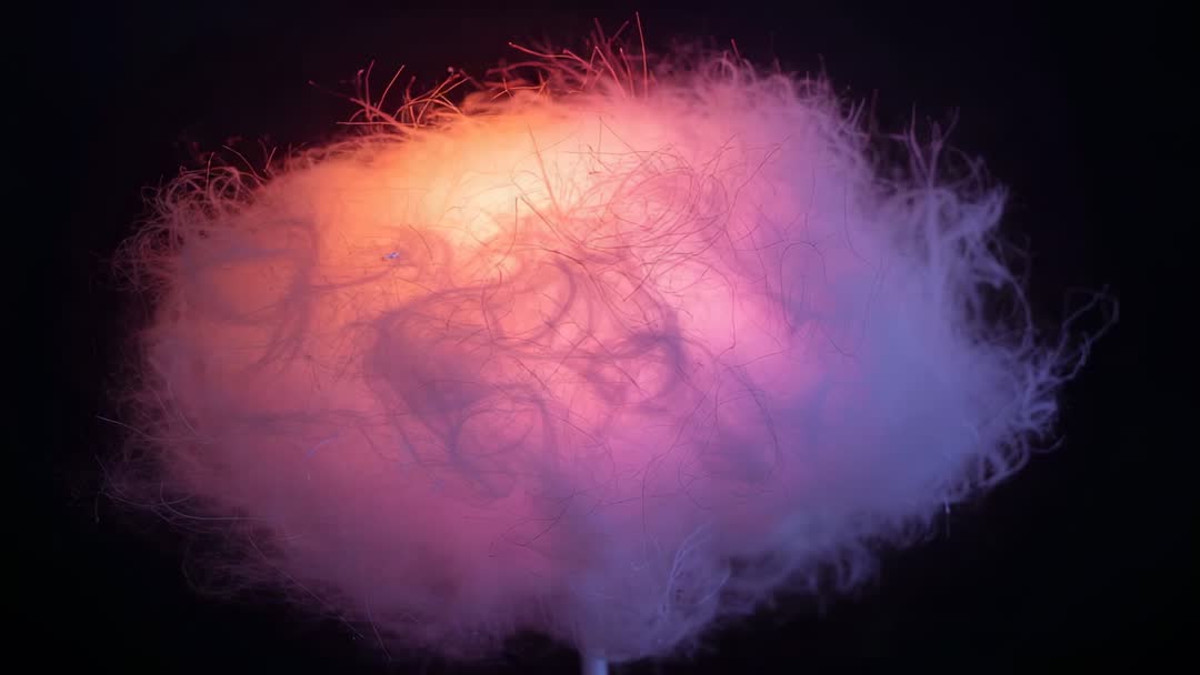 AI Generated Image. Video showing pulsating glowing tuft of fluffy fibers radiating shifting orange, pink and purple light against black backdrop. Close-up macro framing highlighting fine wisps and soft texture, slow rhythmic pulsing creating breathing-like motion. Perfect for background loops in music videos, VJ visuals, meditation and wellness apps, social media reels, website hero banners, product ads, and ambient installations. Color palette working well with minimal typography or neon overlays; footage allowing easy color grading, blending with motion graphics, and adding text overlays. Loop-friendly clip suitable for long-format displays, gallery projection, stage visuals, and decorative screens.