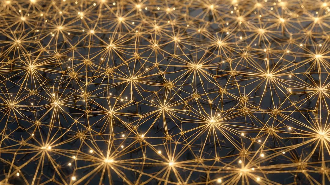 AI Generated Image. Video showing pulsing lattice of lit gold nodes across dark reflective plane, camera pulling back to reveal intricate filaments and tiny sparkling glints. Composition combining radial starburst nodes, interconnecting lines, and soft bokeh highlights, creating layered depth and flowing motion. Lighting emphasizing warm metallic sheen against deep shadow for high-contrast luxury tech look. Ideas for use: technology presentations, AI concept visuals, fintech branding, data visualization intros, startup pitch decks, broadcast title sequences, motion graphics overlays, luxury product commercials, social media promos, website hero backgrounds. Edit notes: wide framing allowing safe cropping and dynamic reframe, compatible with subtle parallax or particle animation, easy color grade for warm gold or cool high-tech palettes. Abstract nature avoiding human subjects, offering versatile backdrop for headlines, lower thirds, logos, and animated overlays.